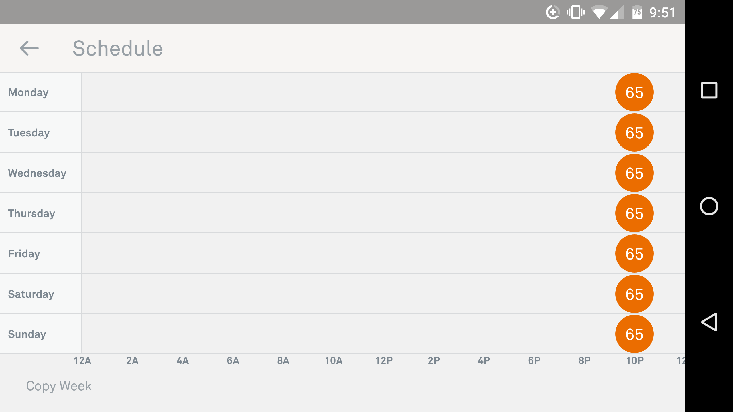 We only have heat, so cooling isn’t a consideration. If we make tweaks throughout the day, we’ll land back at 65° F at 10pm, unless overridden thereafter. I find I’d rather be the one manually cranking it up when we’re cold than to schedule it in assuming we’re going to feel cold. Changing manually is especially easy because we can do it on our devices. Of course, geofencing is on so it knows when we’re away and won’t heat above away temp. There’s always the possibility I’ll change my mind when fall temperatures roll in later this year, but for now this seems to be working fine.